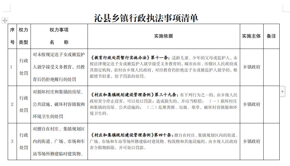 根據《中共沁縣縣委辦公室 沁縣人民政府辦公室關于印發<沁縣深化鄉鎮機構改革推進基層整合審批服務執法力量任務分解>的通知》(室字〔2021〕3號)要求,由縣司法局牽頭梳理出《沁縣鄉鎮行政執法事項清單》,已經縣政府同意,現印發給你們,請遵照執行。