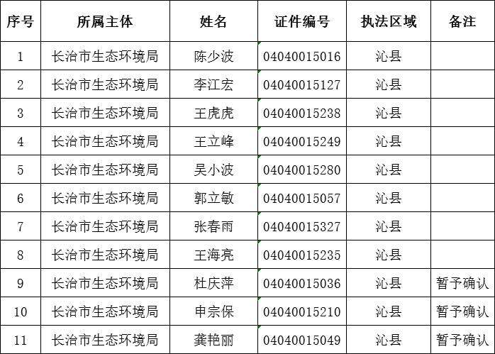 依據《中華人民共和國行政處罰法》和“行政執法三項制度”關于執法信息公示的要求,現對長治市生態環境局沁縣分局持有有效行政執法證件的執法人員名單予以公示。