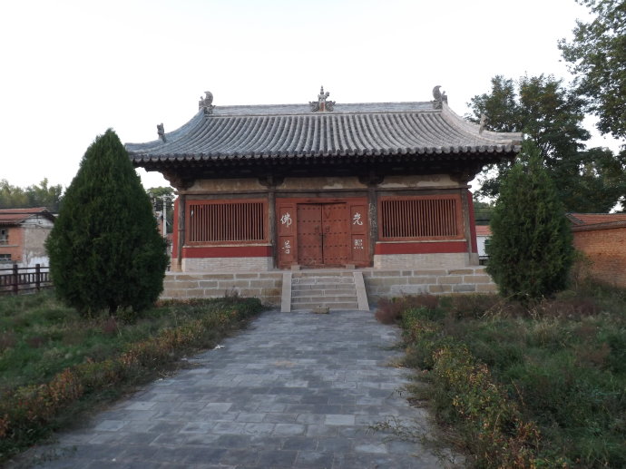 現僅存前殿、后殿等主體建筑。前殿,亦稱中殿,面闊三間,進深二間,四架椽屋,單椽懸山頂。梁架簡潔,斗拱精致,菱形格扇,攔額蕉替,雕刻華麗,為清代重修時的風格。后殿為寺院中現存的一座主要建筑,廣深三間,高臺筑殿,平面形制為正方形,六架椽屋,單檐懸山頂。仝礎石質。上雕履花瓣,花瓣清晰,刻制精細。檐柱側角升起顯著,殿內四根金柱柱頭卷剎緩各。柱頭斗拱為五鋪作單抄單下昂,重拱計心造。梁架斗拱用材敦厚肥實,木作手法古樸洗練。內外肩墻部砌筑2.5厘米厚的防潮隔析,此種做法在他處所少見,殿內明間上部添置天花板,為明清重修時后加之物。東西山墻頂端殘存40多平方米壁畫,圖案精美,格調高雅。屋面坡度較為和緩,出檐較深,檐出微微向上,具有柔和飄逸之美感。正脊垂脊琉璃鴟吻,口吞口,脊剎垂獸,色質渾厚,圖案精美。西山博風、懸魚、惹草點綴得當。殿內僅存重修碑及金代敕賜寺名碑兩通,記載了金崇慶年重修寺院與敕賜寺名之祥情。1986年8月18日,山西省人民政府公布為省第二批重點文物保護單位,現為國家級重點文物保護單位。