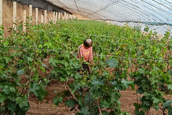 圖為:村民正在對棚內的葡萄進行掐蔓、疏果